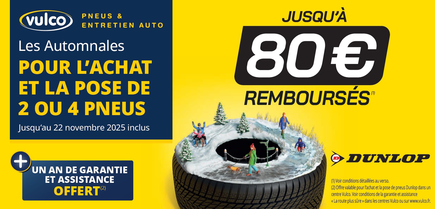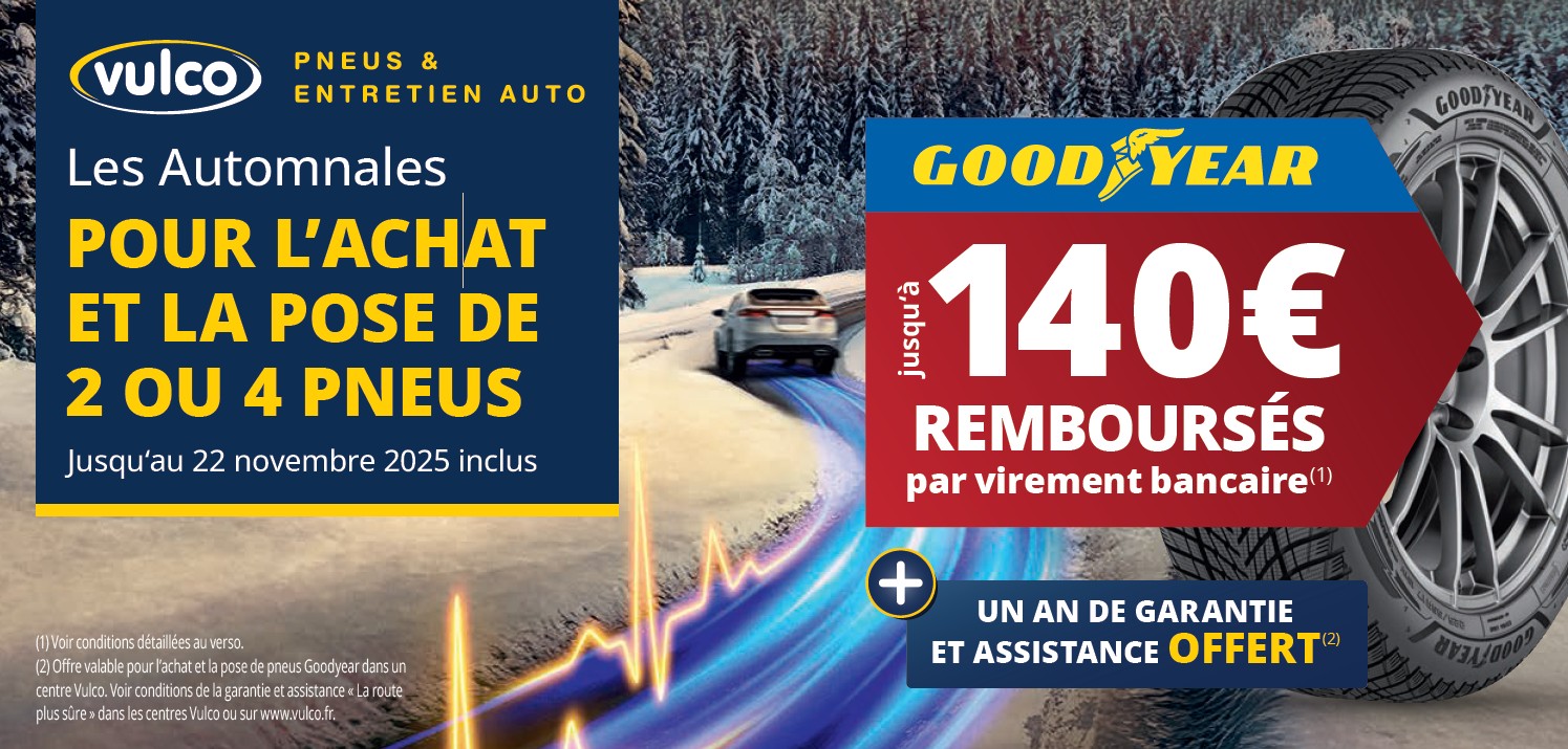 – Jusqu’à 140€ de remboursés par virement bancaire pour l’achat et la pose de pneus Goodyear ou Dunlop.